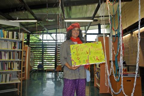« L'artisseuse », comme elle se définit, tisse des liens artistiques dans les divers espaces de l’Espace Nougaro médiathèque, amphithéâtre- PIJ… Elle est inspirée par des liserés de tissus et des fils fabriqués dans notre belle région qui brille dans les métiers du textile depuis longtemps… Cette œuvre, intitulée « Tissons des L i e n s ensemble pour notre bien-être », participe au thème de l’année dans la commune : « Le bien être-Soyez bien ici ». L’installation de ces fils colorés se fait avec la participation des adhérents de la médiathèque, des enfants du Centre de loisirs, du Café pour Tous… « Je rêve qu'à l'image de cette création où tous ces fils s'agencent ensemble et créent des liens pour participer à une œuvre harmonieuse et colorée, tous les êtres humains puissent créer des liens entre eux et avec la nature et les animaux afin de participer à une vie harmonieuse, ici, et ailleurs, partout sur la terre, métissages colorés, joyeux, d’amitiés, de solidarités de fraternités dans l'amour et la paix », indiquait l’artiste, dont le travail sera présenté le jour de la fête de l’Espace Claude-Nougaro, le vendredi 15 juin.